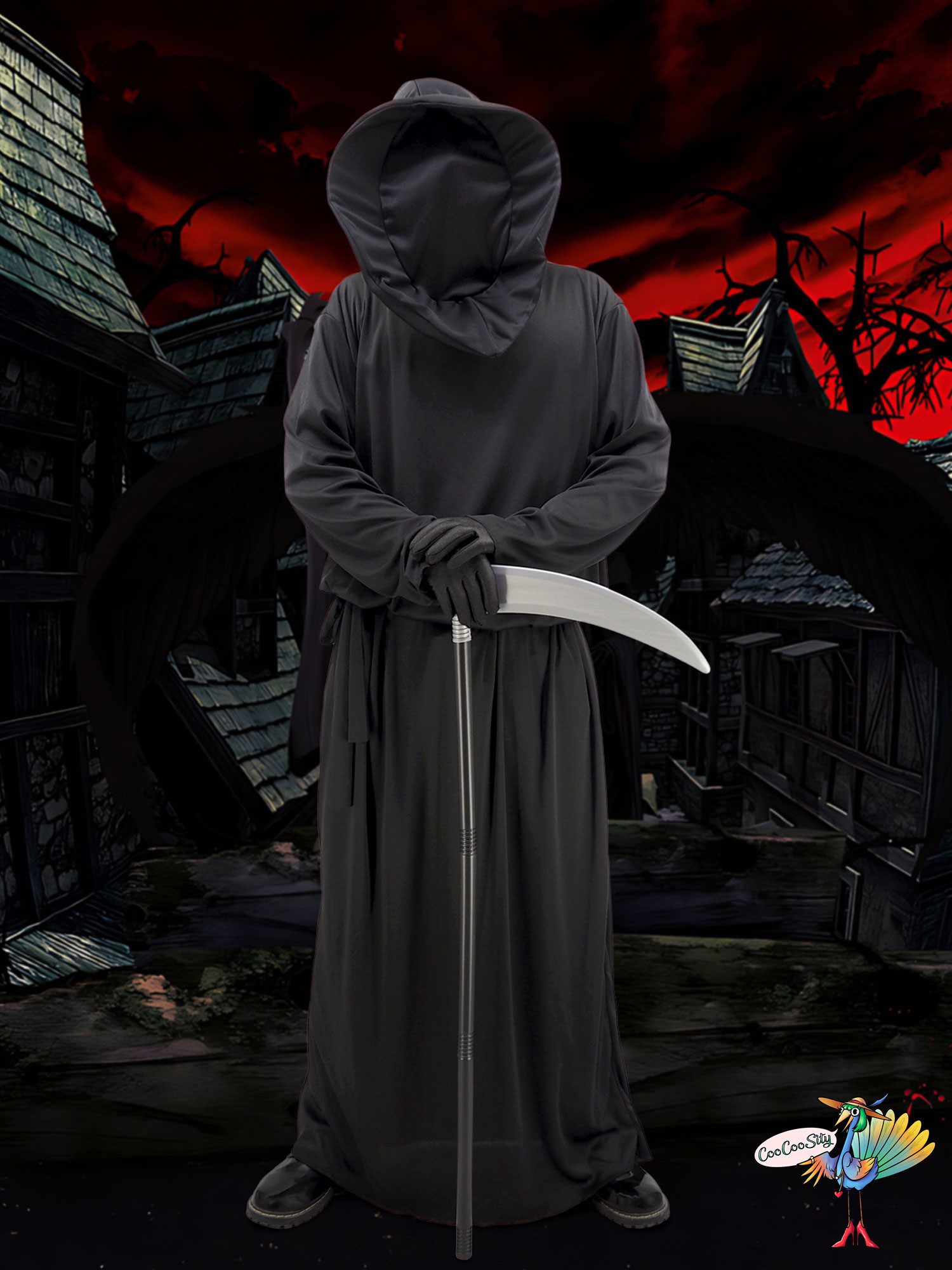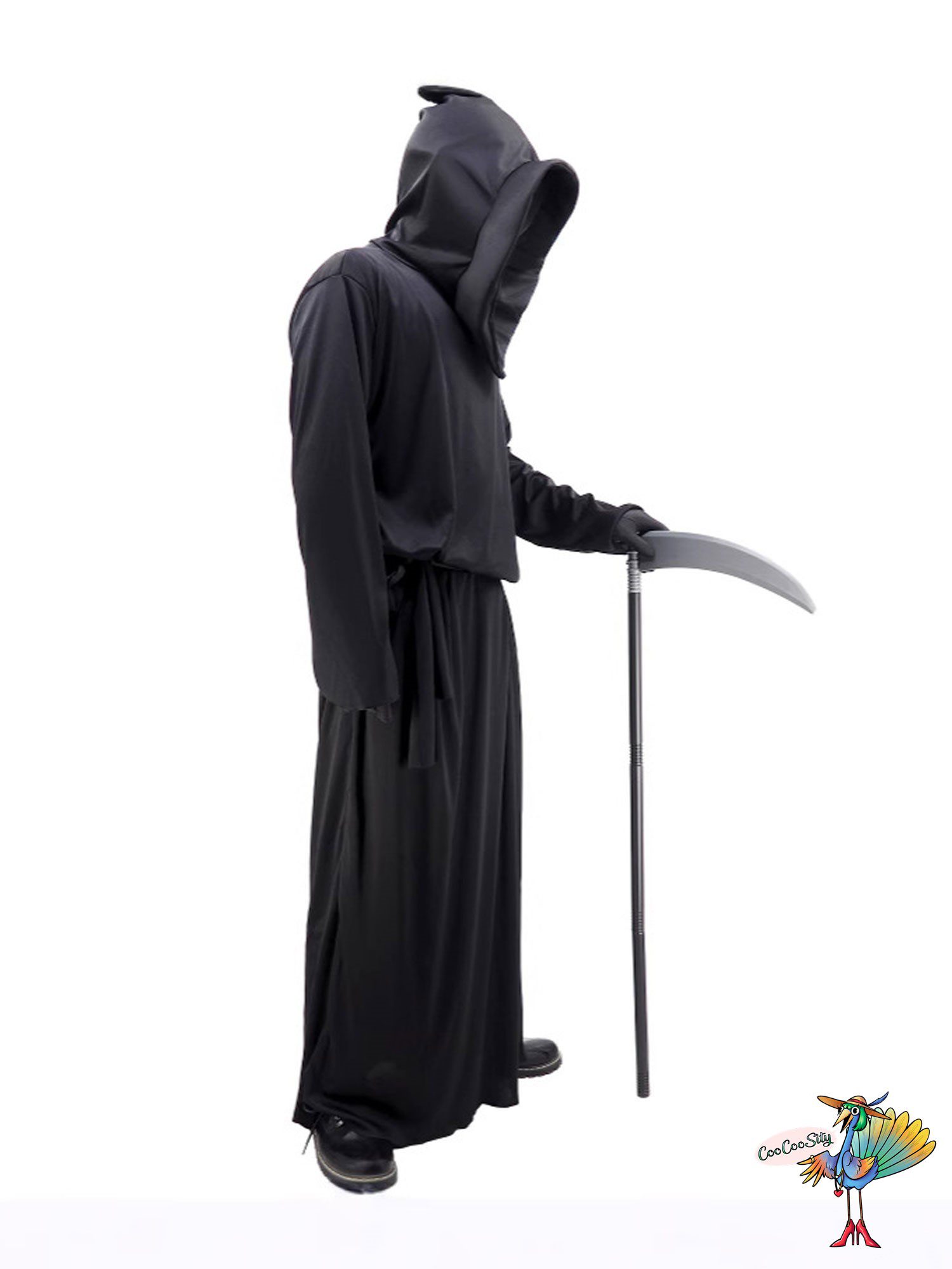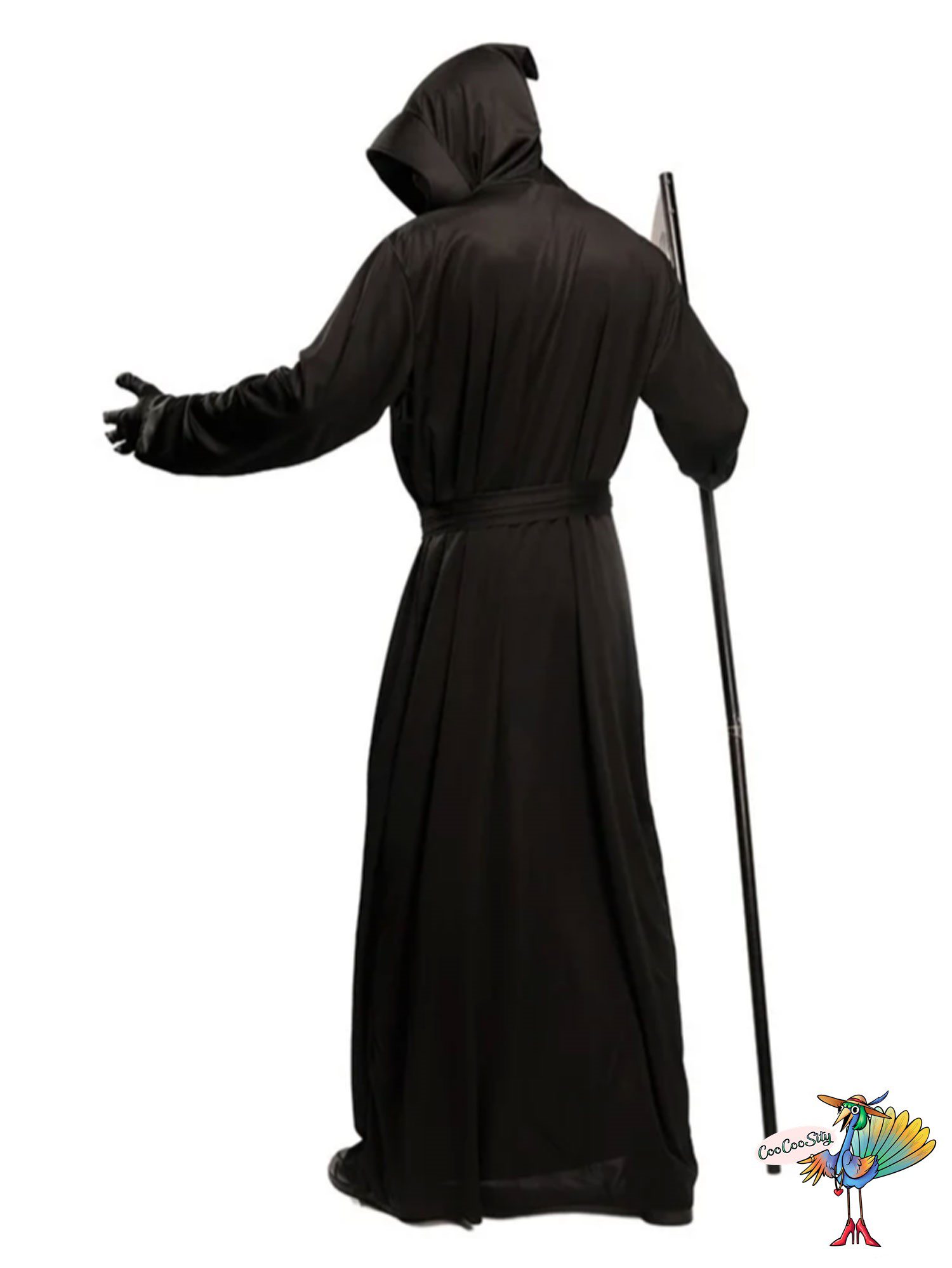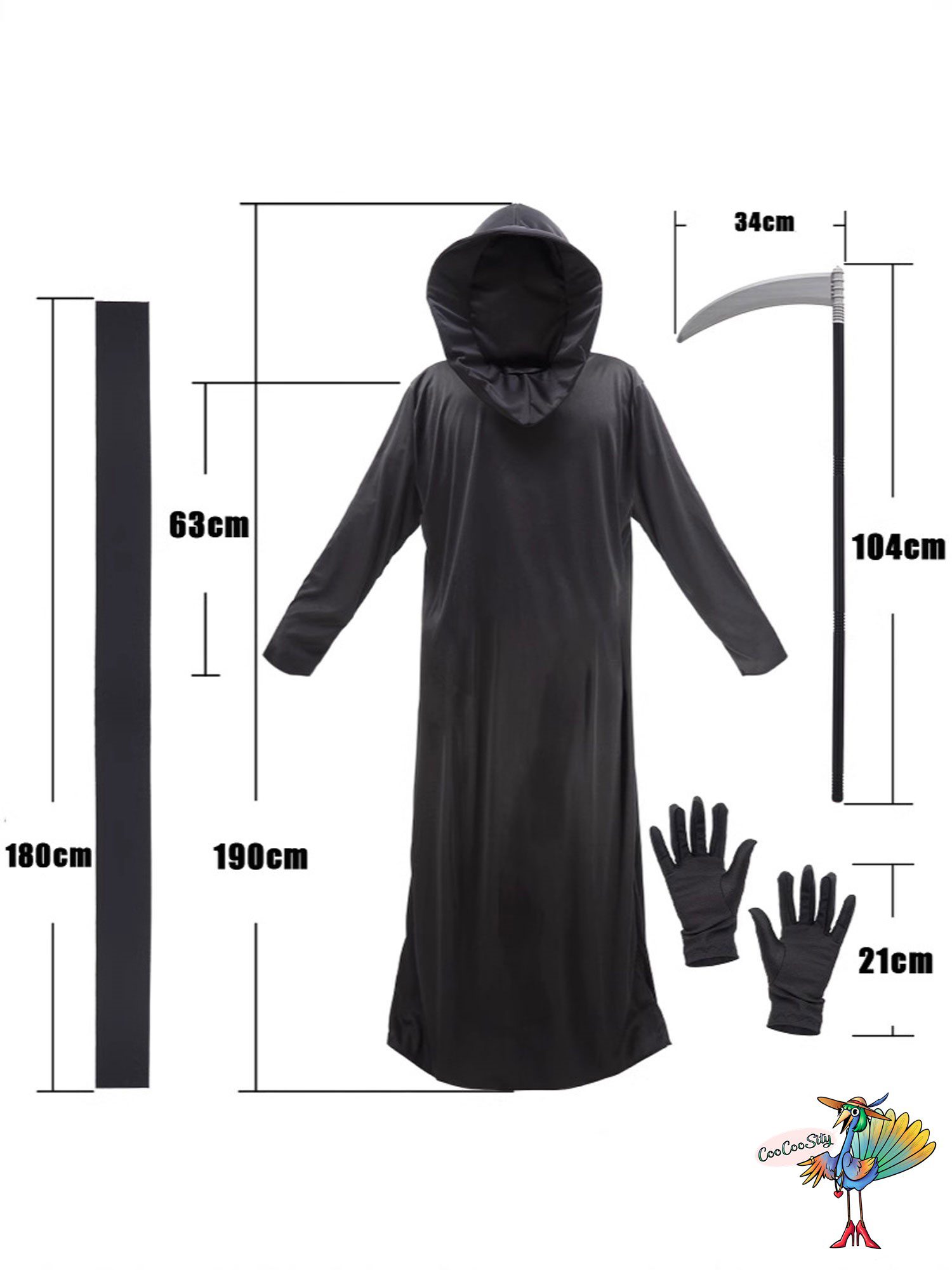 В костюм входит: туника с капюшоном, пояс, перчатки, коса