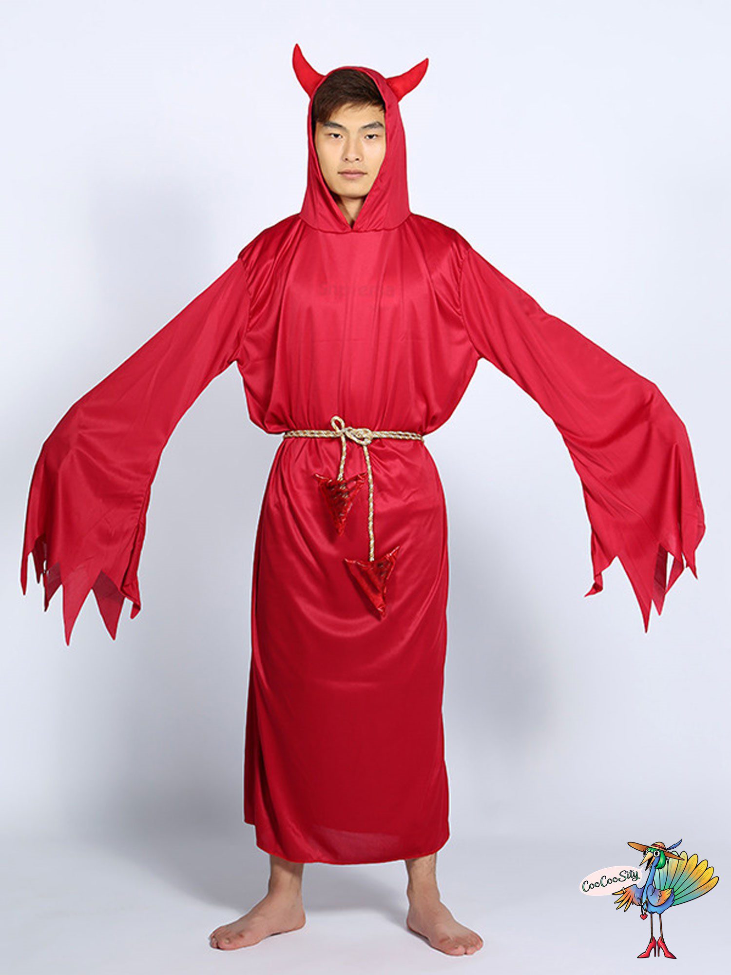 В костюм входит: красная туника с капюшоном и рожками, а также веревочный пояс