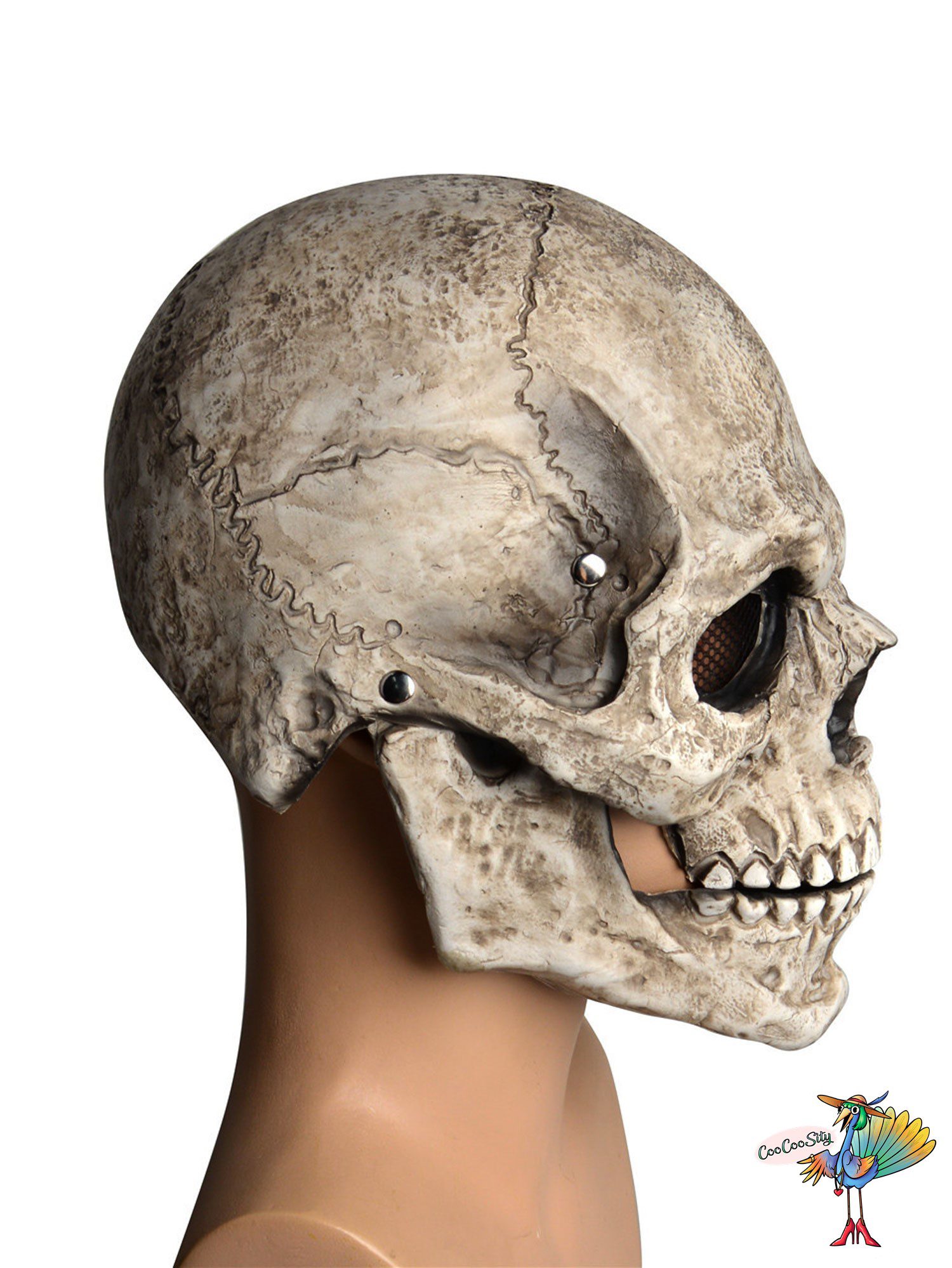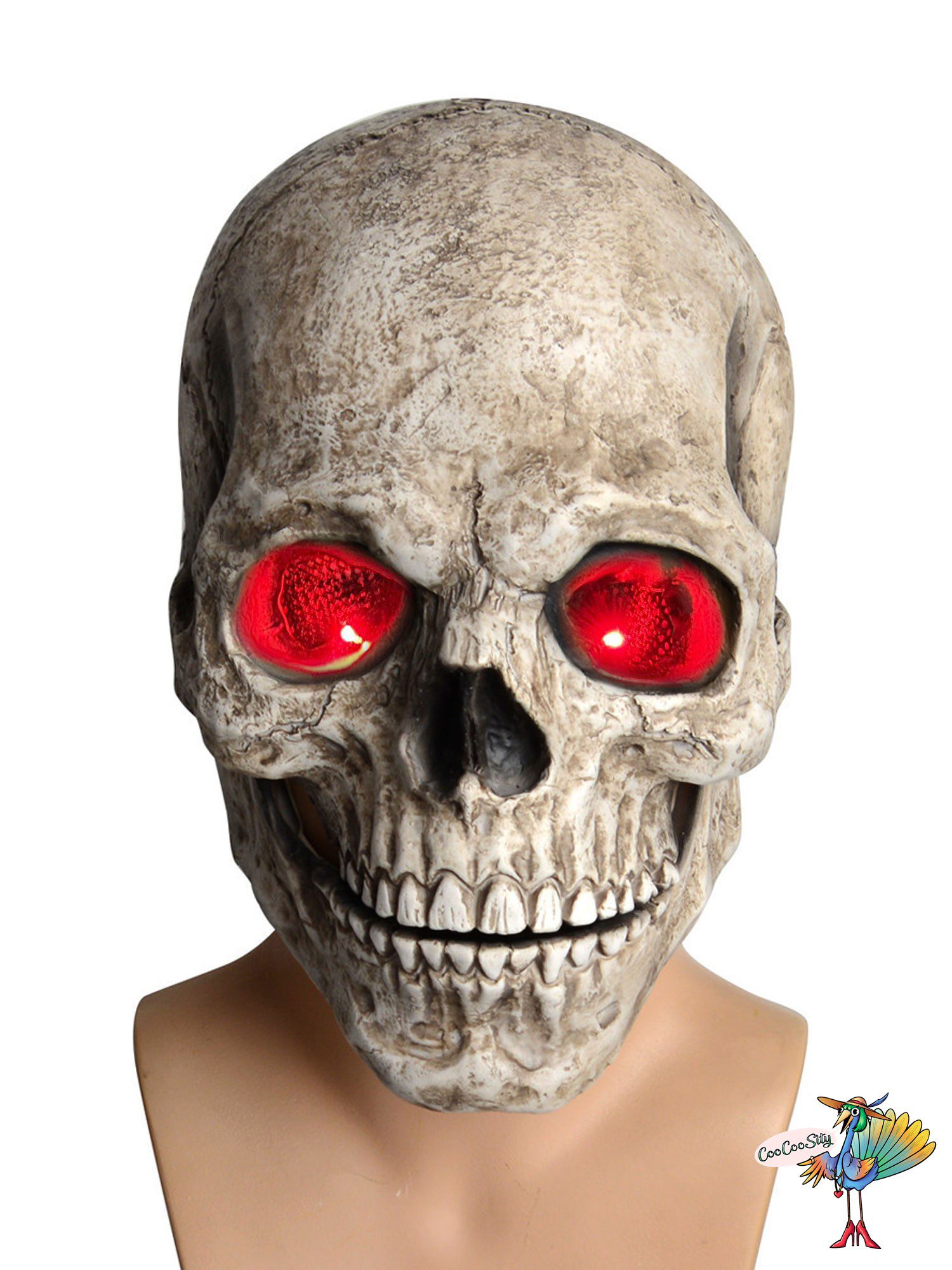 Маска череп для Хэллоуина, которая разработана в форме скелета с двигающейся нижней челюстью и красной подсветкой глаз. Изготовлена из высококачественного эмульсионного материала для длительного использования.