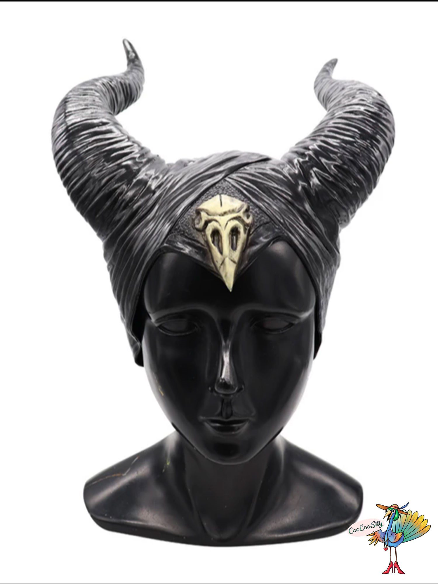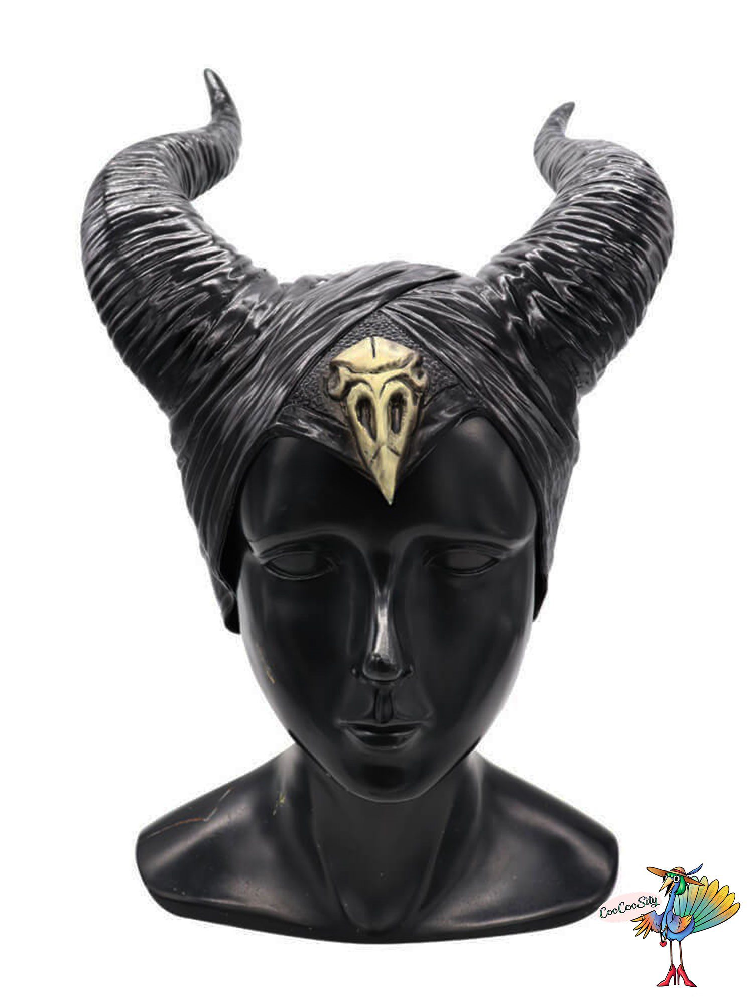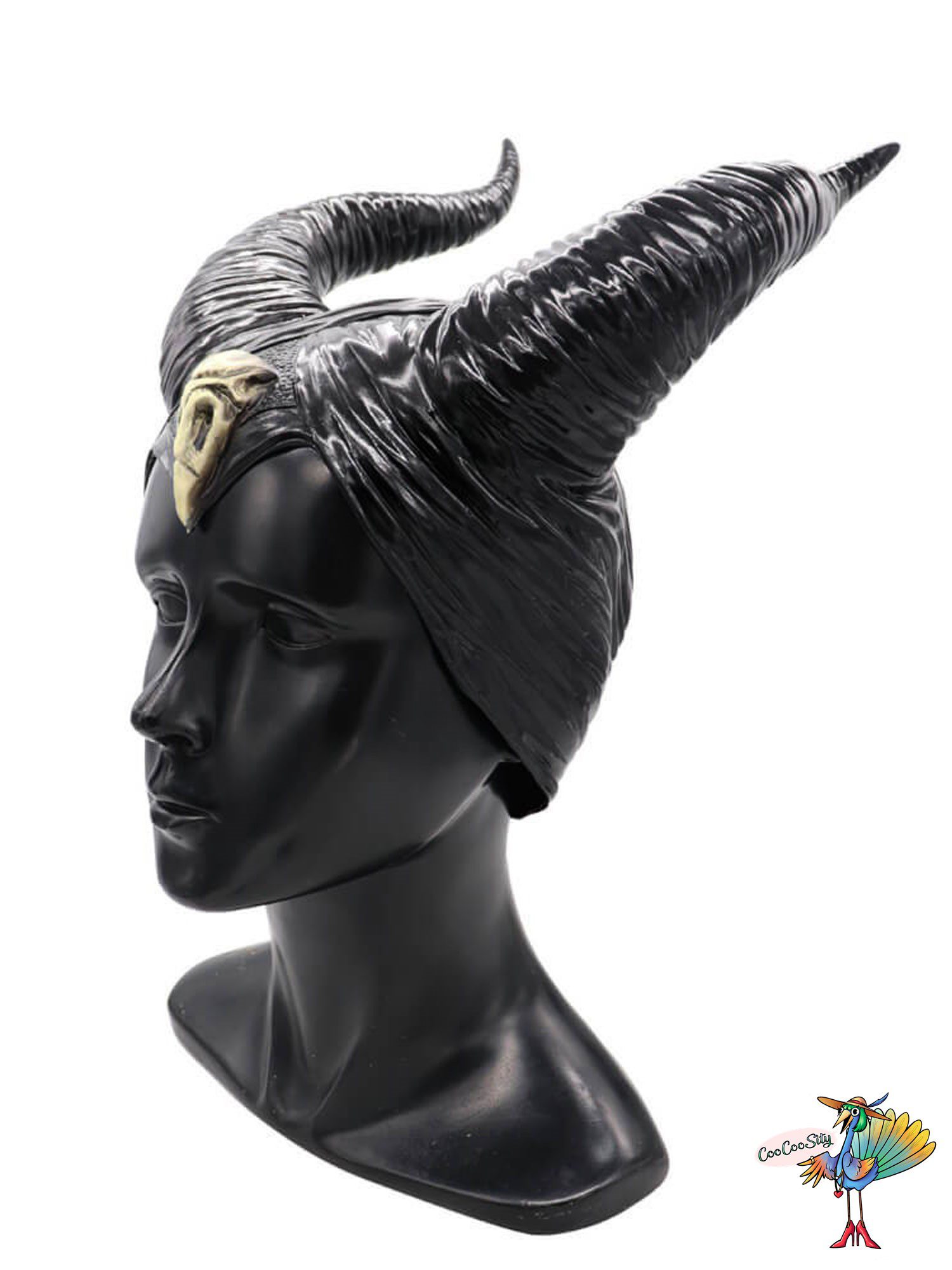 черные рога Малефисенты декорированы бежевым черепом на лбу.