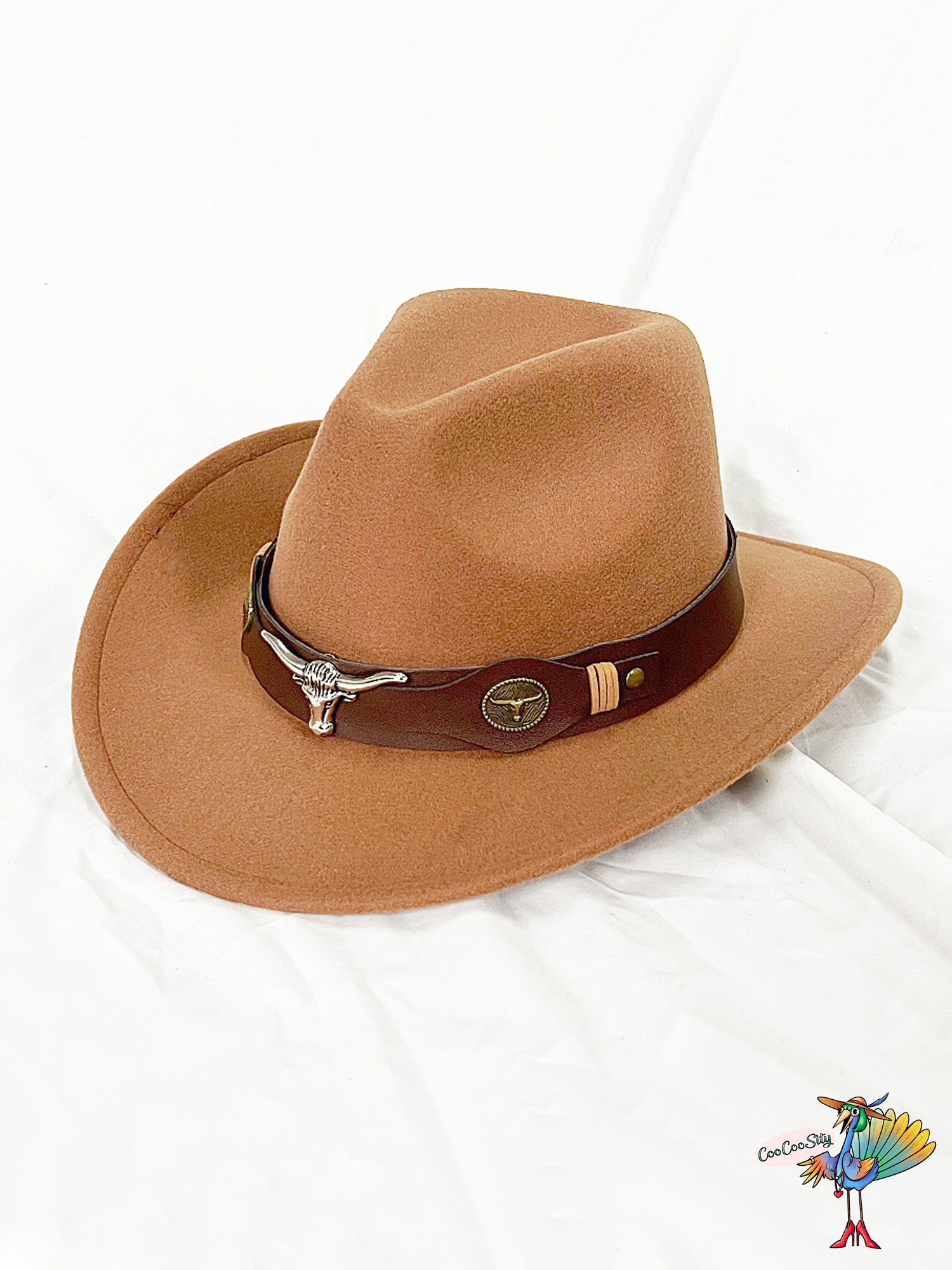 Шляпа декорирована ремешком из эко-кожи с брошью в виде головы быка.